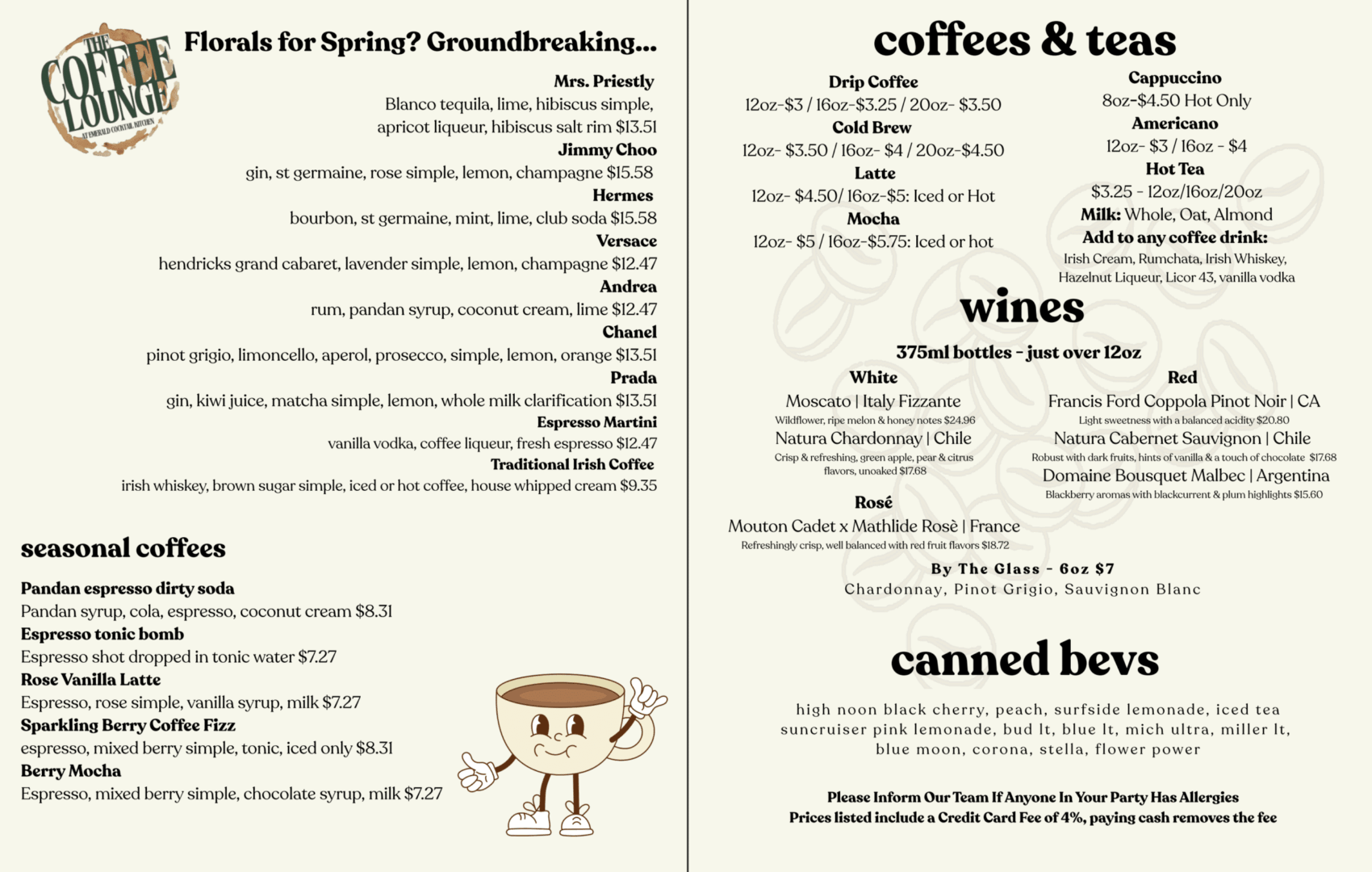 on the second floor, our coffee lounge offers handcrafted espresso drinks, seasonal coffee creations, teas, and cozy café favorites.