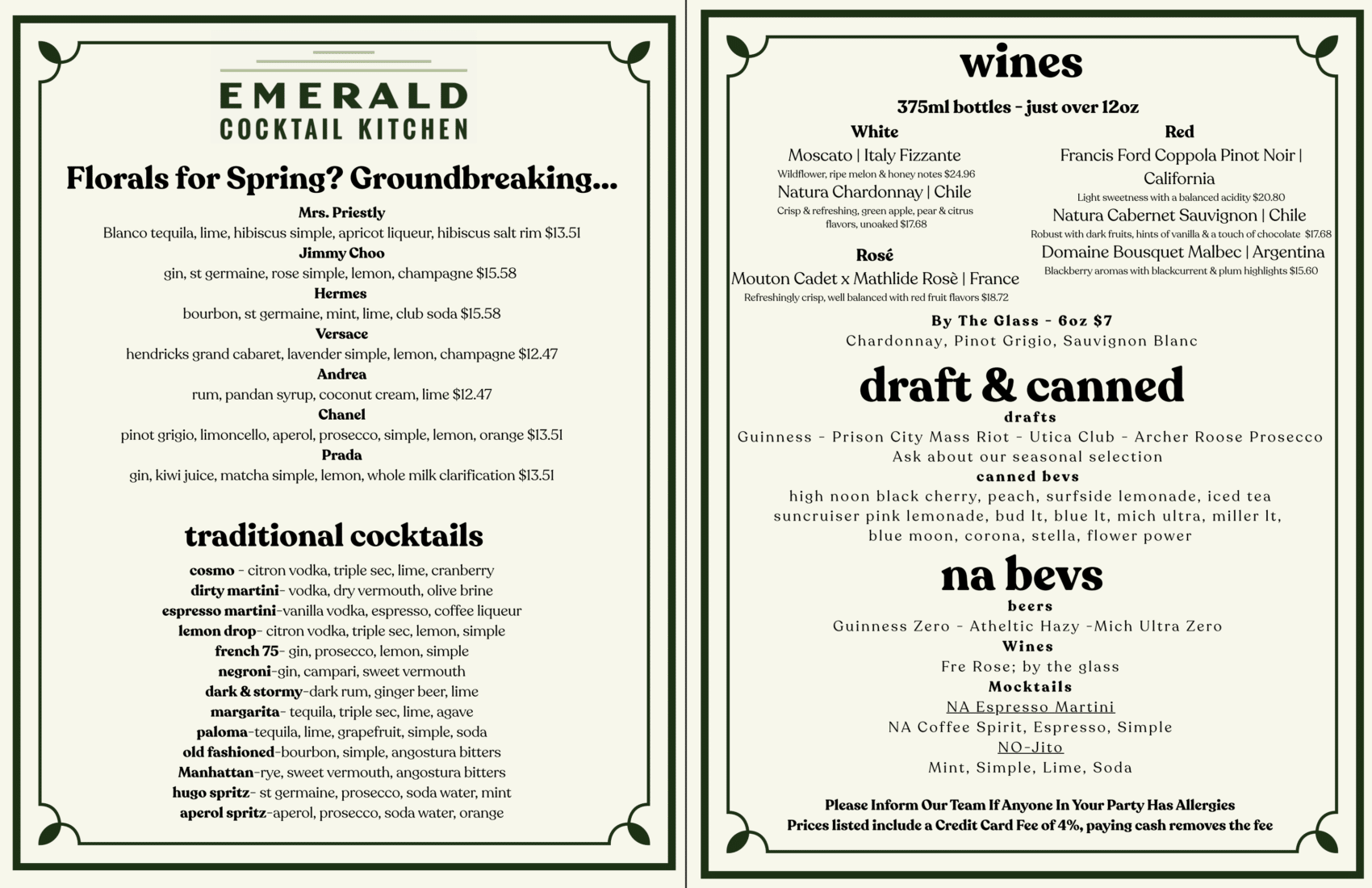 Please inform your server if you or anyone in your party has any food allergies. Be aware that our kitchen is not an allergy-free space and does prepare nut, dairy, seafood, and gluten products. Our team will be as accommodating as possible to keep you safe, but cross-contamination can occur.